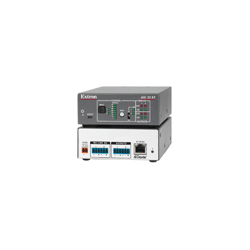 The Extron AXI 22 AT is a quarter rack width audio interface for integrating two mic/line sources onto a Dante®-enabled audio system. It features two mic or line inputs on a 3.5 mm captive screw connector, with switchable 48 volt phantom power. Input select, gain, and phantom power settings are controllable from the front panel, via DSP Configurator Software, or by SIS commands via USB. The AXI 22 AT also features two line level outputs for routing any two Dante channels from the network to the audio system. The AXI 22 AT interfaces with any Dante-equipped audio processor, such as an Extron DMP 128 Plus C AT, over a standard local area network, and can be powered through PoE. This allows a single network cable connection for bidirectional audio and power from a central equipment rack.